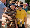 Игроку завязывают глаза, дают в руки ножницы, не сильно раскручивают и направляют в сторону весящих призов.