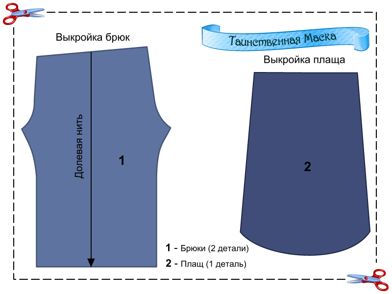 Для создания романтического образа Таинственной маски вам понадобятся брюки, водолазка, плащ и маска. Можете использовать имеющиеся в вашем гардеробе черные брюки или сшить их самостоятельно. Распечатайте выкройку брюк, увеличьте детали на миллиметровой бумаге в соответствии со своими мерками, раскроите ткань, добавляя по 1 см на припуски. Сложите детали лицевой стороной внутрь и сострочите шаговые швы, обметайте края. Сострочите средний шов и обработайте края. Подшейте пояс брюк так, чтобы получилась кулиска. Вставьте резинку и сшейте концы. Подверните и прострочите низ брюк.