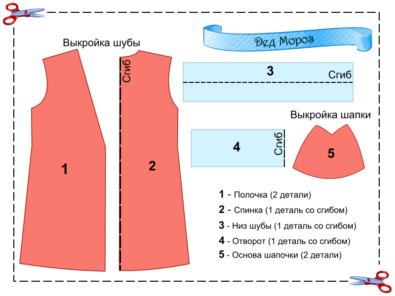 Разумеется, для изготовления шубы Деда Мороза вам понадобится материал красного цвета и куски белого меха или коротковорсового материала. Распечатайте, увеличьте выкройку на миллиметровой бумаге в соответствии со своими мерками и переведите на ткань выкройку шубы, добавляя по 1 см на припуски. Вырежите детали. Сшейте серединный шов спинки, сложив ее половинки лицевой стороной внутрь. Сложите вместе лицевыми сторонами внутрь детали спинки и полочки и сострочите плечевые и боковые швы. Обработайте края швов. Сложите рукава вдоль лицом внутрь и сострочите нижние швы. Обметайте края. Пришейте рукава к основе шубы.