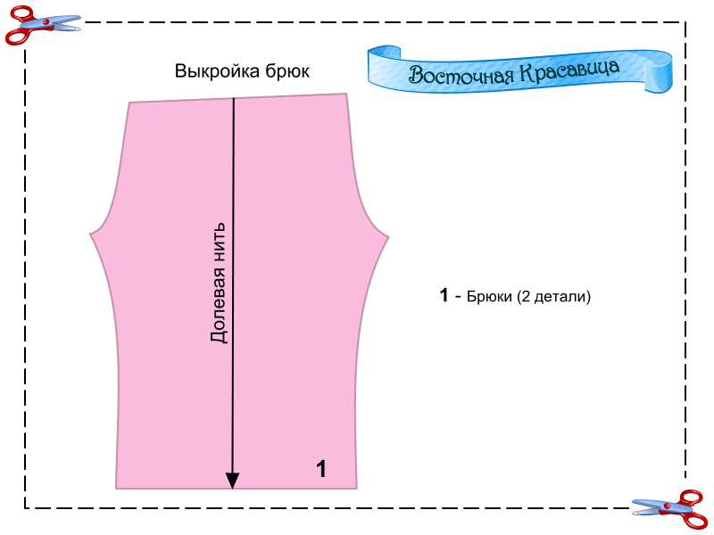 Выкройку для шаровар можно сделать на основе обычных брюк. Не забудьте увеличить детали на миллиметровой бумаге в соответствии со своими мерками. Только ширину штанин от бедер нужно увеличить. На поясе и нижних частях штанин сделайте кулиски для резинок.