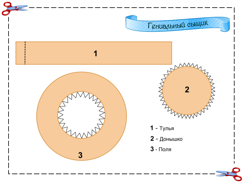 Сверните и склейте подготовленную полоску, спрятав внутри лишние 2 см. Поместите сверху маленькую окружность и зубчики приклейте внутри. Снизу расположите поля и зубчики, загнутые вверх, приклейте внутри к бокам шляпы.