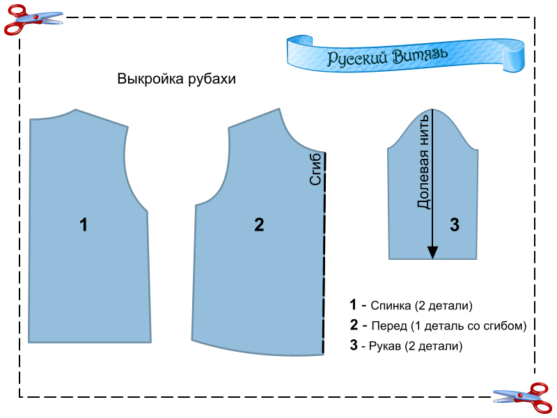 Распечатайте выкройку рубахи, увеличьте детали на миллиметровой бумаге в соответствии со своими мерками, раскроите ткань, добавляя по 1 см на припуски. Ткань лучше использовать светлую и однотонную.