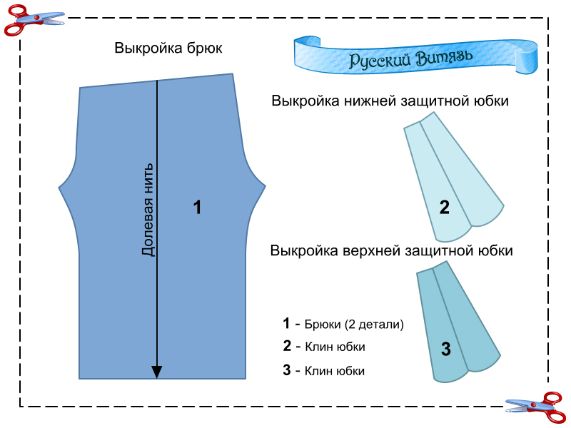Для штанов подберите ткань в тонкую полоску или мелкий рисунок. Распечатайте выкройку, увеличьте детали на миллиметровой бумаге в соответствии со своими мерками, раскроите ткань, добавляя по 1 см на припуски. Сложите детали лицевой стороной внутрь и сострочите шаговые швы, обметайте края. Сострочите средний шов и обработайте края. Подшейте пояс брюк так, чтобы получилась кулиска. Вставьте резинку и сшейте концы. Подшейте брюки. Нижние края штанин можете собрать резинками.