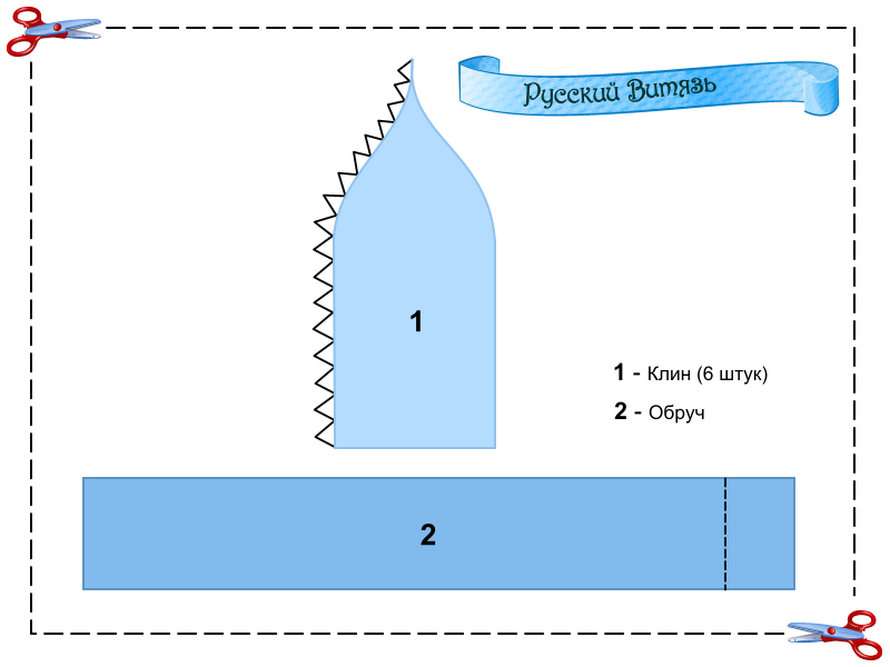 Обруч оберните по самому низу клиньев, предварительно наклеив на передней части стрелочку острием вверх. Вырежите и прикрепите к обручу украшения из картона, например круги, ромбы и так далее. Покрасьте шлем «серебрянкой» или оклейте фольгой.