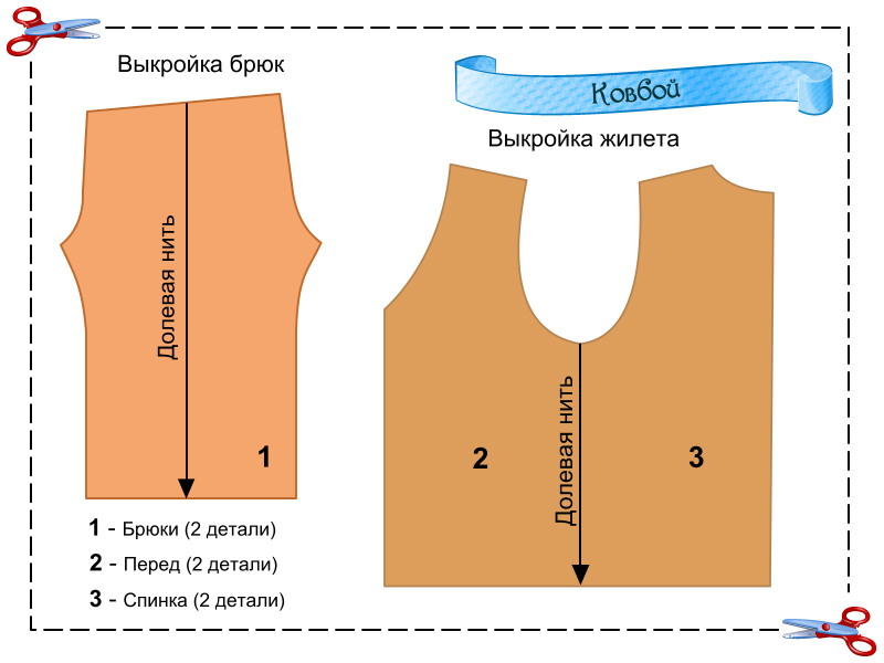 Для изготовления костюма ковбоя распечатайте выкройку брюк, увеличьте детали на миллиметровой бумаге в соответствии со своими мерками, перенесите их на ткань, добавляя припуски по 1 см, и вырежите детали. Сложите детали лицевой стороной внутрь и сострочите шаговые швы, обметайте края. Сострочите средний шов и обработайте края. Подшейте пояс брюк так, чтобы получилась кулиска. Вставьте резинку и сшейте концы. Когда будете сострачивать боковые швы, не забудьте вставить между ними бахрому на всю длину или от колена до низа штанов.