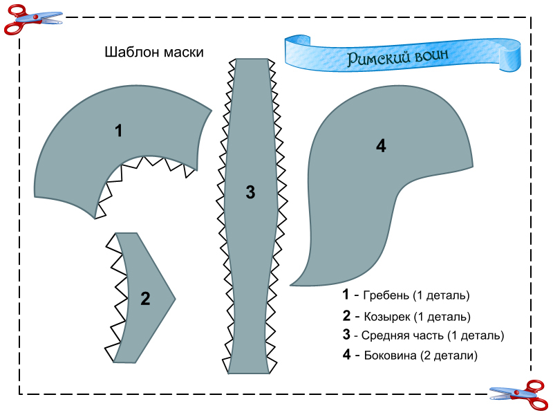 Распечатайте и перенесите на плотный картон детали шлема. Вырежите их по контуру. Если необходимо, заранее увеличьте их в соответствии со своими размерами. В средней части загните книзу зубчики, смажьте их клеем и прикрепите к ним две боковины. Спереди к средней части приклейте козырек, разместив зубчики внутри. Канцелярским ножом аккуратно сделайте прорезь в средней части для гребня. Просуньте в щель зубчики и приклейте их изнутри, отгибая то вправо, то влево. Вырежите четыре уголка для жесткости и приклейте по два с обеих сторон гребня.