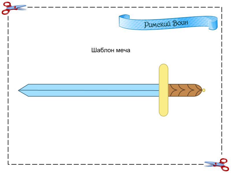 Распечатайте и переведите на картон шаблон меча. Вырежите и склейте в несколько слоев. Можете оклеить меч фольгой, а рукоять обмотать тонким шнуром, приклеив кончики.