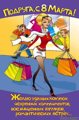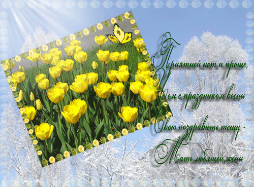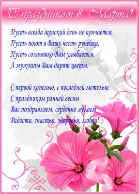 8 Марта, официально называющийся как «Международный женский день» - это праздник наших милых и любимых женщин. Это повод поздравить своих любимых жен и матерей, коллег по работе и подруг. Выбирайте открытки с 8 Марта, поздравляйте знакомых и дарите им радость. См. также: поздравления с 8 Марта.