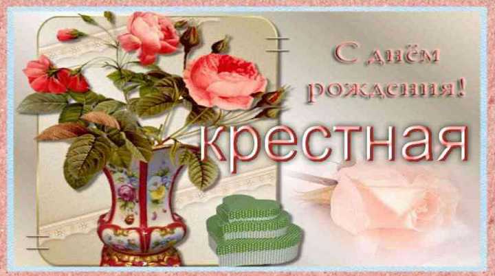 Крестная! Сегодня у Вас День Рождения! Я от всей души хочу поздравить Вас с этим замечательным праздником! Желаю Вам семейного счастья и благополучия, уюта и тепла в доме, карьерного роста на работе, и любви в семье! Крепкого здоровья, всегда радостной улыбки на лице и огненных глаз!
