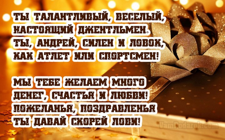Значение имени: "мужественный" (древнегреч). Это имя обладает столь сильной энергетикой, что ее с лихвой хватает на всех в мире Андреев. Андрей - весельчак, Андрей - балагур, заводила, душа компании, часто везунчик, которому удача, кажется, сама идет в руки. Но не все так просто, как видится со стороны. Многое дается Андрею благодаря тяжелому труду и терпению.