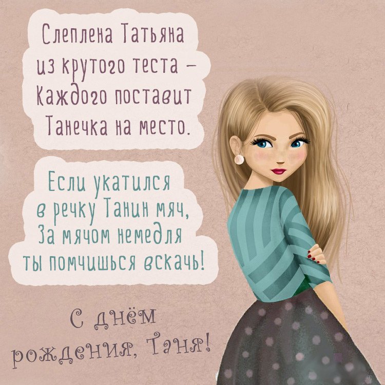 Татьяна, имя твоё означает «устроительница». И это не случайно! Ведь ты добиваешься всего сама: семья, карьера… В твоих друзей - ты общительна и раскована, душа компании. Пусть и дальше всё у тебя складывается, пусть здоровье не подводит, пусть любовь близких и друзей греет тебя! С Днём рождения!