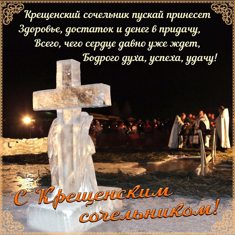 В крещенский сочельник желаю истинного блага в семье и теплых надежд в доме, искренних чувств и добрых желаний, щедрости души и чуткости сердца, хорошего достатка и большой удачи, радостного праздника и светлых эмоций.