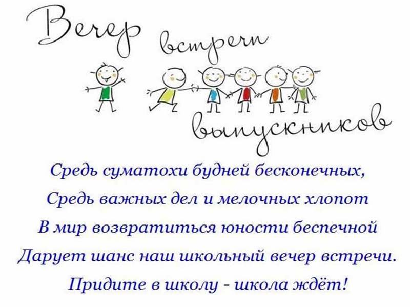 Вот уже столько лет прошло, все изменились, повзрослели и стали серьезнее. Но все равно в душе мы остались такими же детьми, озорными и веселыми. В этот день хочу пожелать тебе оставаться таким же задорным, смелым, готовым на любые подвиги, чтобы тот юношеский огонек в твоей душе никогда не погас. С Днем встречи выпускников!