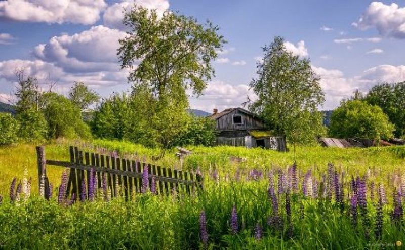 Луг с деревенской хатой...